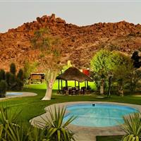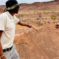 Wizyta etniczna w Living Museum, prezentującym kulturę Damara. Przedstawiciele ludu, ubrani w tradycyjne stroje, krok po kroku przybliżą nam swój specyficzny język, domy, narzędzia pracy, rękodzieło, a także śpiew i taniec. Po lunchu czeka nas wizyta w Twyfelfontein, miejscu wpisanym na listę UNESCO, gdzie na rdzawych skałach znajduje się ponad 2000 rycin stworzonych przez Buszmenów. Przedstawiają one zwierzęta, myśliwych, polowania, ludzi i ich styl życia. Popołudnie z romantycznym zachodem słońca, kolacja i nocleg w malowniczo położonej lodży z basenem, pośród skalistych zboczy Damaraland.