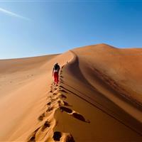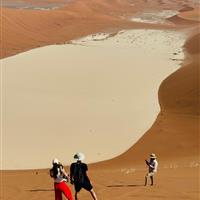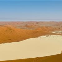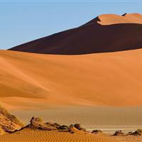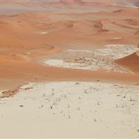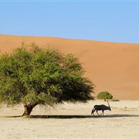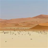 Wcześnie rano rozpoczniemy podróż do Sossusvlei – krainy najwyższych piaszczystych wydm na Ziemi, w tym charakterystycznej Dune 45. Po dotarciu na miejsce wyruszymy na spacer wśród pomarańczowych wydm Deadvlei. Surrealistyczny krajobraz, z kontrastującą grą cieni i światła porannego słońca, zachwyci Cię swoimi kształtami i barwami. Istnieje tu duża szansa napotkania antylopy oryks, szczególnie dobrze przystosowanej do przetrwania w najbardziej suchych warunkach, mogącej przeżyć nawet wiele miesięcy bez dostępu do źródła wody. Głównym celem naszej wędrówki będzie wznosząca się na ponad 380 m n.p.m. Big Daddy, jedna z najwyższych wydm Namibii, dostarczająca widoków, które wręcz proszą się, aby uchwycić je okiem kamery. Tuż pod nią naszym oczom ukaże się słynny wyschnięty las akacji, dokąd udamy się schodząc po stromych zboczach wydm, co jest uczuciem równie przyjemnym, jak niezwykłym. Akacje, jakby zamrożone w czasie, tkwią nieruchomo pośród cichego krajobrazu, zdominowanego przez intensywne odcienie pustynnej czerwieni i błękitu nieba. To jedyne w swoim rodzaju doświadczenie pozostawia niezapomniane wrażenia. Po południu udamy się jeszcze na wędrówkę po skalnych formacjach kanionu Sesriem. Na koniec dnia przejazd do lodży, kolacja i nocleg.