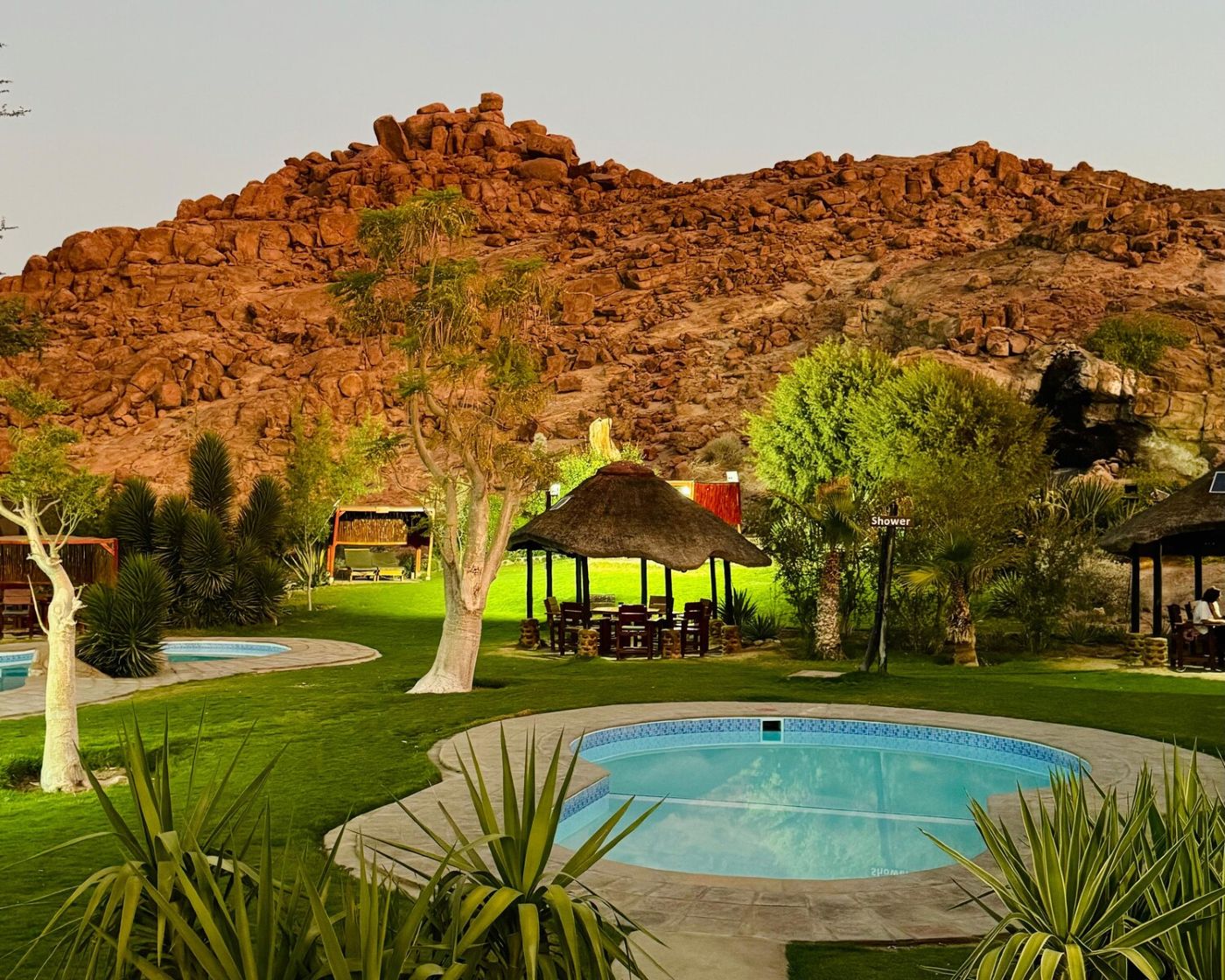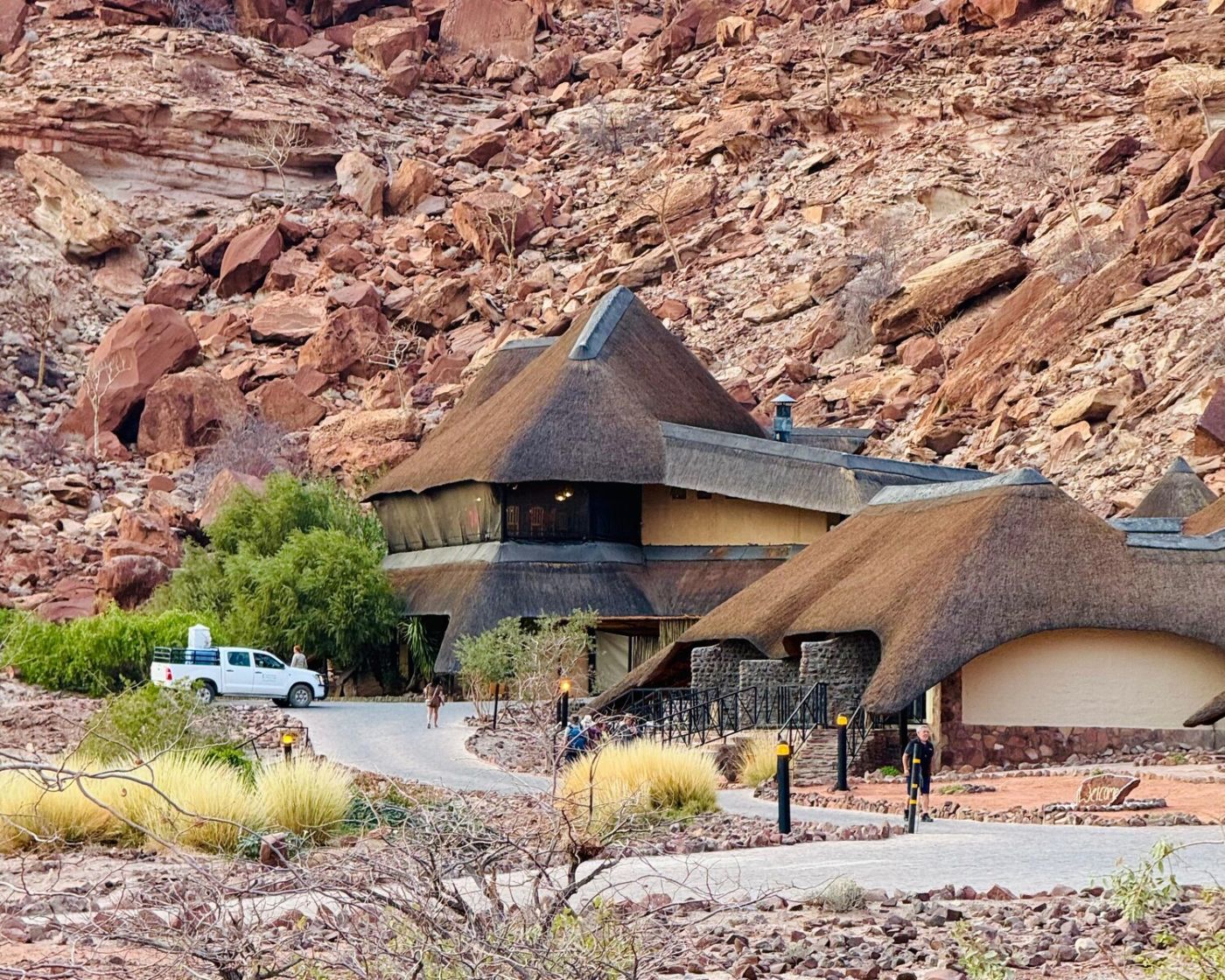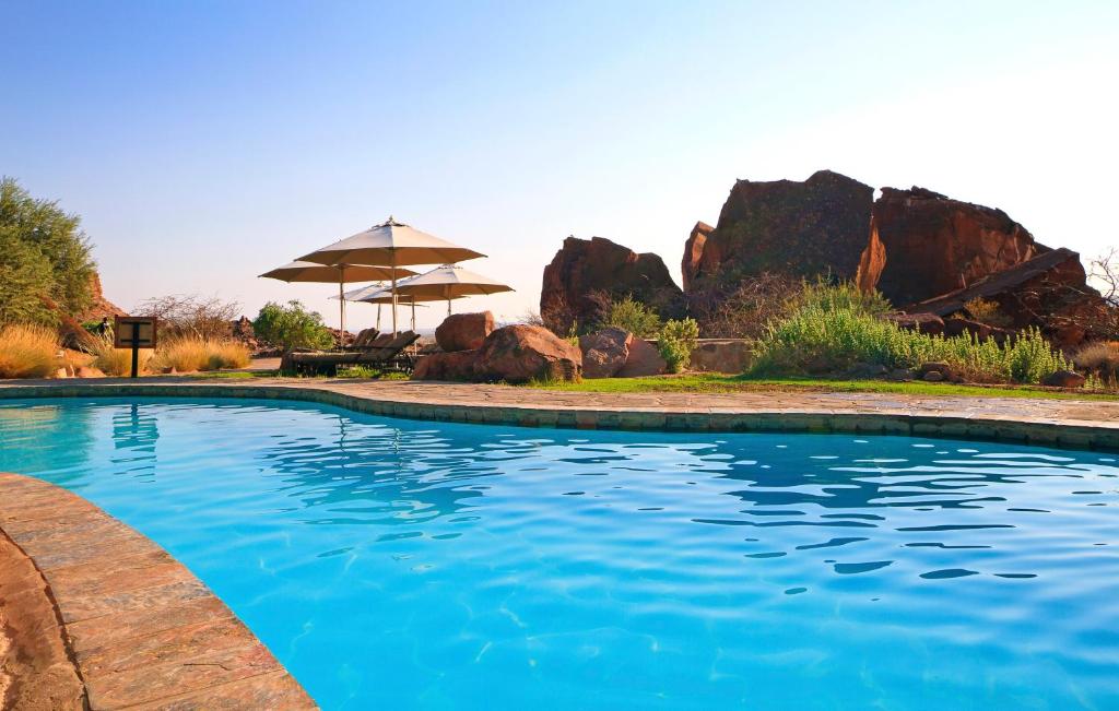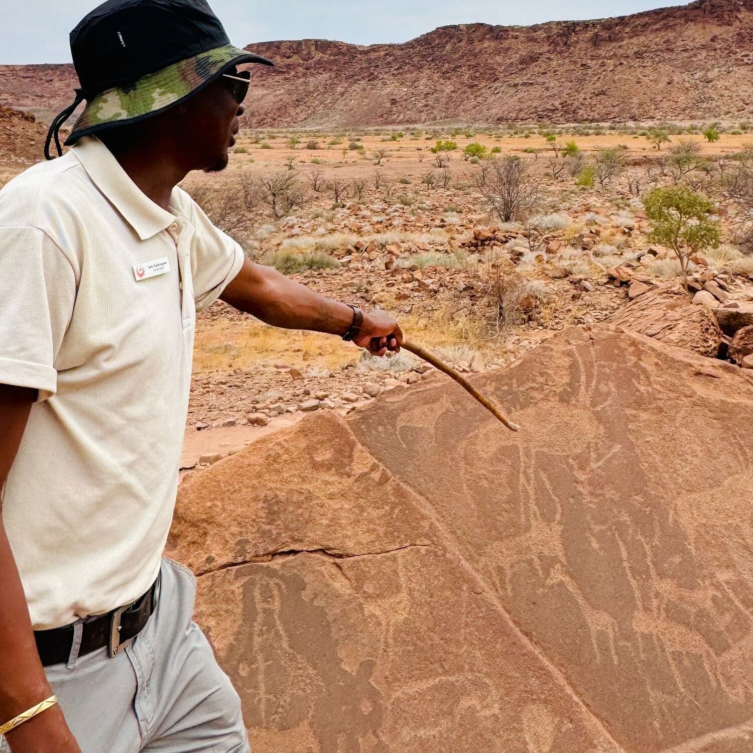 Wizyta etniczna w Living Museum, prezentującym kulturę Damara. Przedstawiciele ludu, ubrani w tradycyjne stroje, krok po kroku przybliżą nam swój specyficzny język, domy, narzędzia pracy, rękodzieło, a także śpiew i taniec. Po lunchu czeka nas wizyta w Twyfelfontein, miejscu wpisanym na listę UNESCO, gdzie na rdzawych skałach znajduje się ponad 2000 rycin stworzonych przez Buszmenów. Przedstawiają one zwierzęta, myśliwych, polowania, ludzi i ich styl życia. Popołudnie z romantycznym zachodem słońca, kolacja i nocleg w malowniczo położonej lodży z basenem, pośród skalistych zboczy Damaraland.