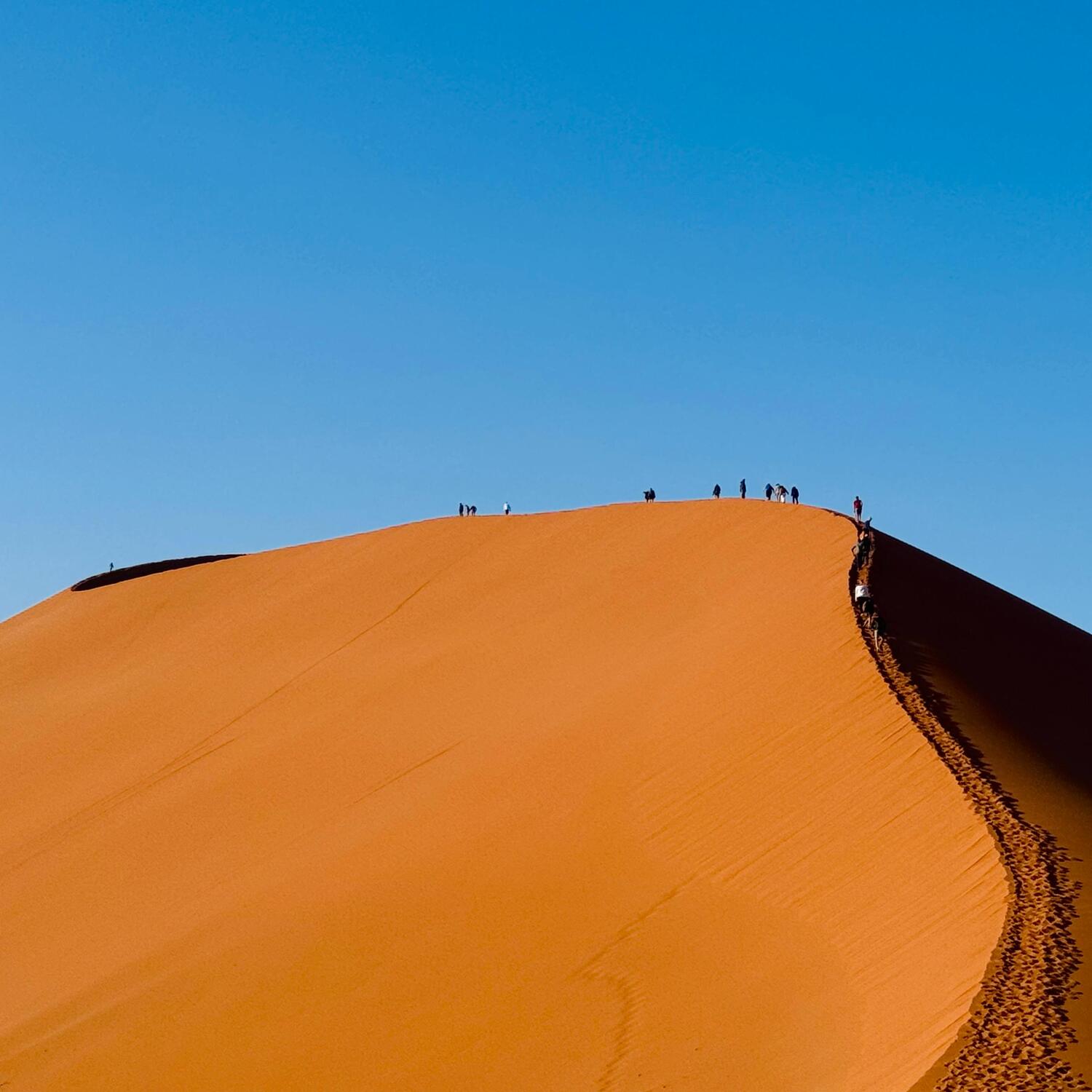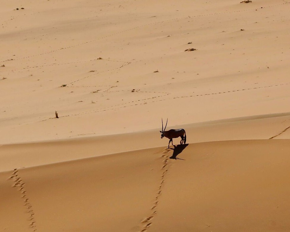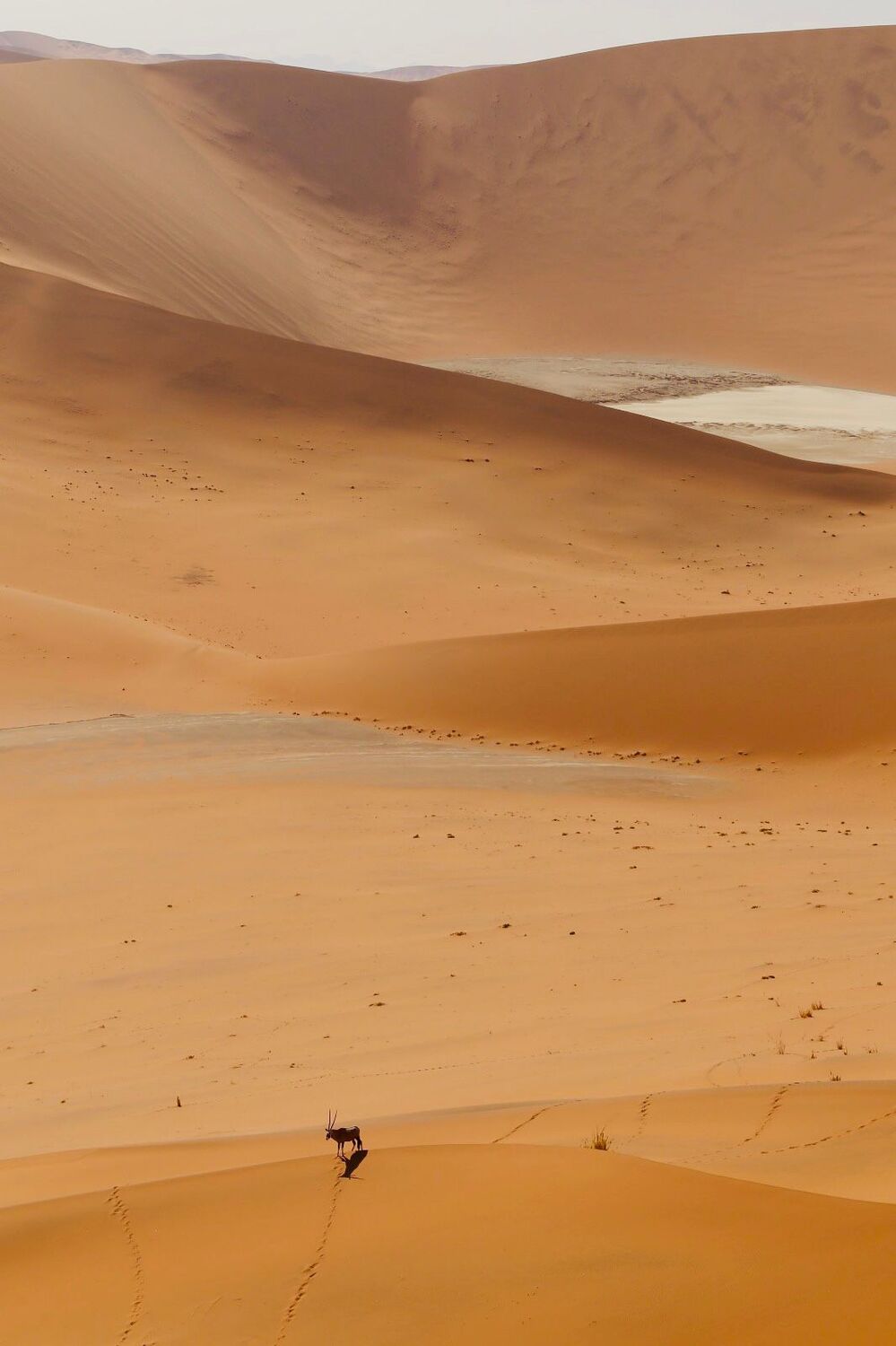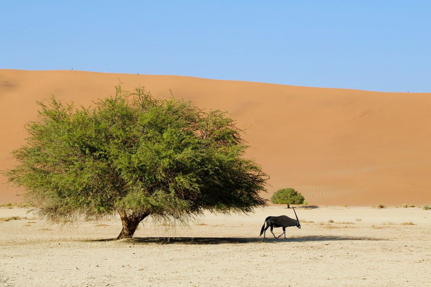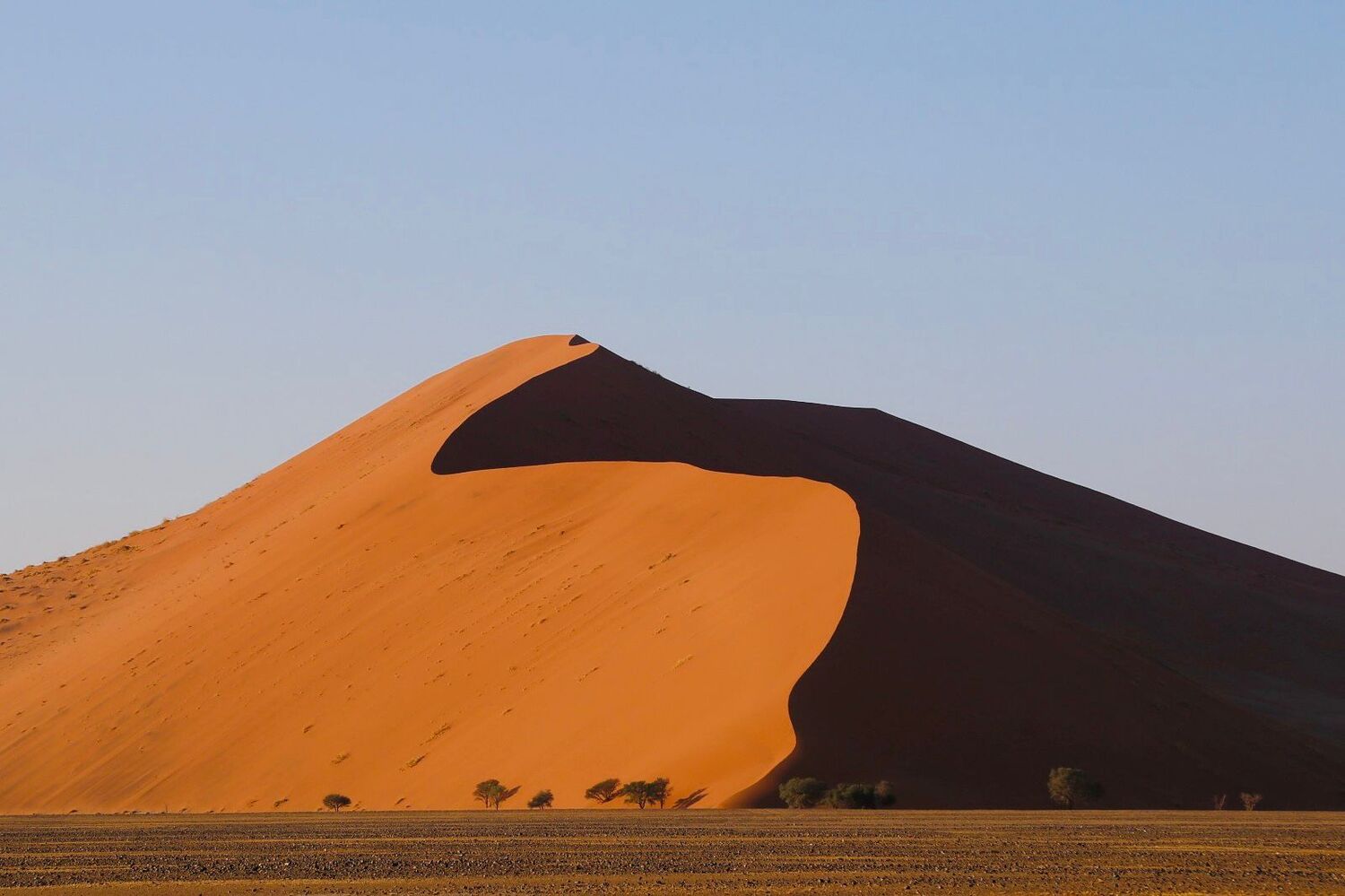 Wcześnie rano rozpoczniemy podróż do Sossusvlei – krainy najwyższych piaszczystych wydm na Ziemi, w tym charakterystycznej Dune 45. Po dotarciu na miejsce wyruszymy na spacer wśród pomarańczowych wydm Deadvlei. Surrealistyczny krajobraz, z kontrastującą grą cieni i światła porannego słońca, zachwyci Cię swoimi kształtami i barwami. Istnieje tu duża szansa napotkania antylopy oryks, szczególnie dobrze przystosowanej do przetrwania w najbardziej suchych warunkach, mogącej przeżyć nawet wiele miesięcy bez dostępu do źródła wody. Głównym celem naszej wędrówki będzie wznosząca się na ponad 380 m n.p.m. Big Daddy, jedna z najwyższych wydm Namibii, dostarczająca widoków, które wręcz proszą się, aby uchwycić je okiem kamery. Tuż pod nią naszym oczom ukaże się słynny wyschnięty las akacji, dokąd udamy się schodząc po stromych zboczach wydm, co jest uczuciem równie przyjemnym, jak niezwykłym. Akacje, jakby zamrożone w czasie, tkwią nieruchomo pośród cichego krajobrazu, zdominowanego przez intensywne odcienie pustynnej czerwieni i błękitu nieba. To jedyne w swoim rodzaju doświadczenie pozostawia niezapomniane wrażenia. Po południu udamy się jeszcze na wędrówkę po skalnych formacjach kanionu Sesriem. Na koniec dnia przejazd do lodży, kolacja i nocleg.