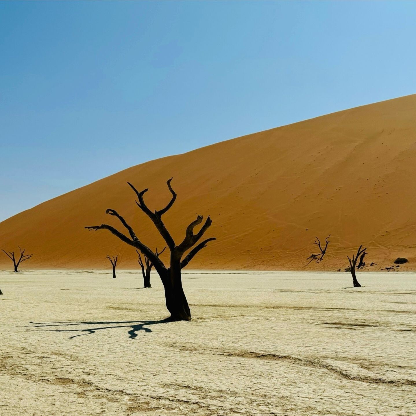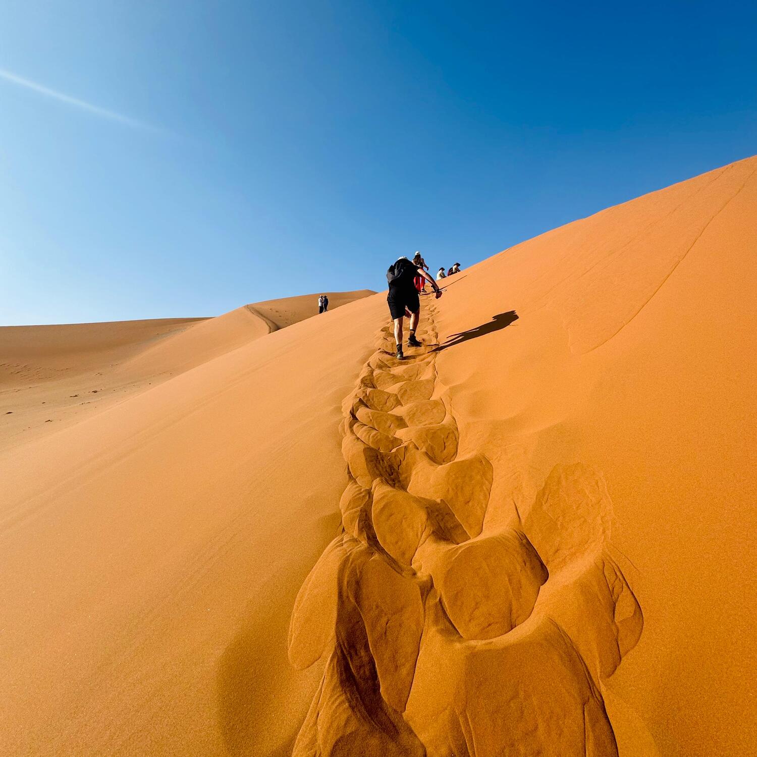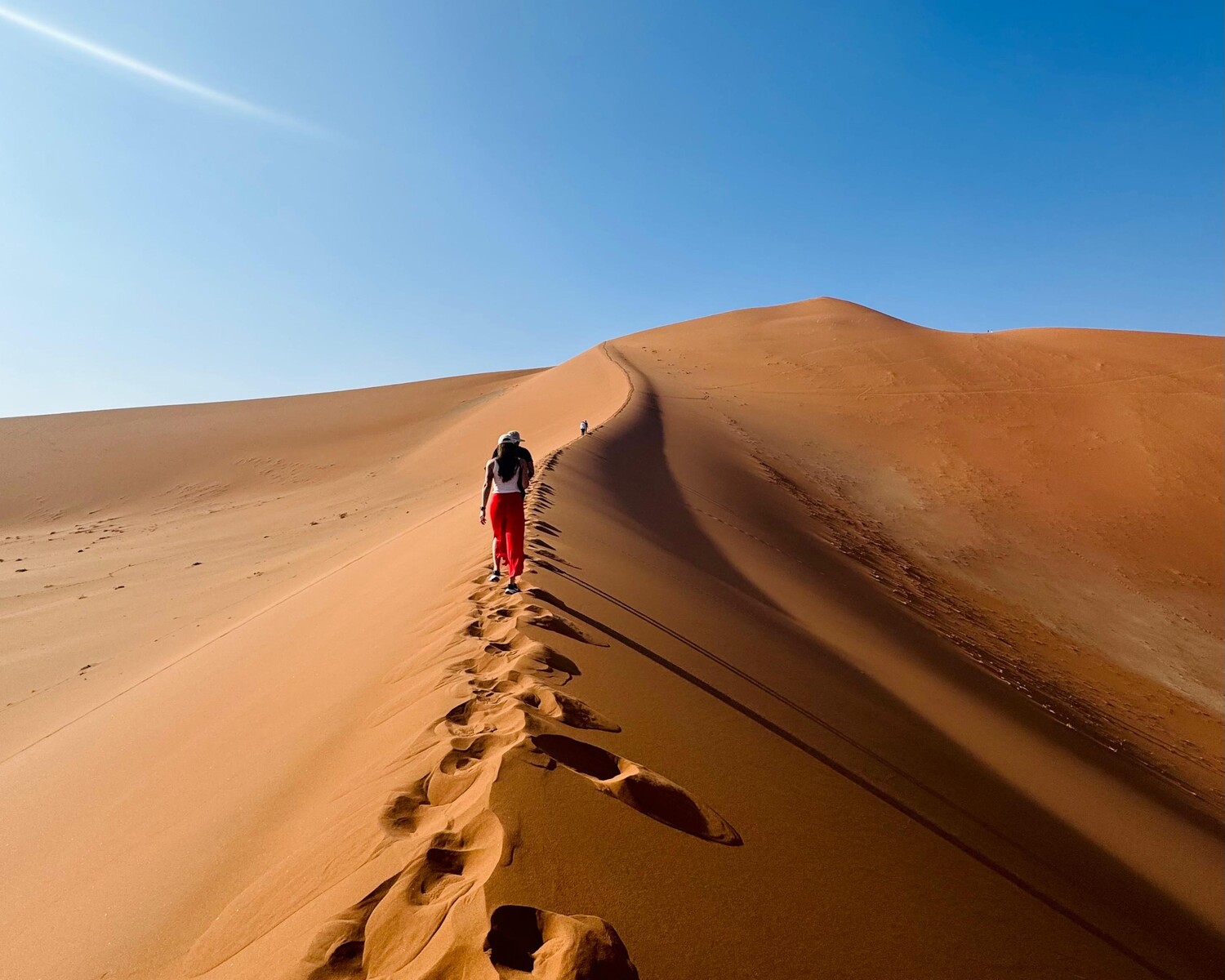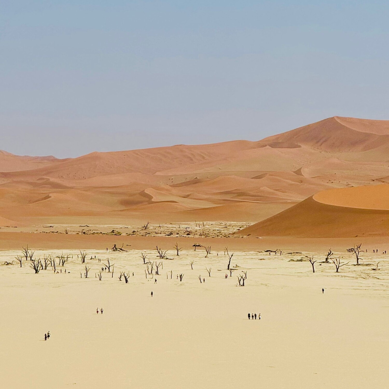 Wcześnie rano rozpoczniemy podróż do Sossusvlei – krainy najwyższych piaszczystych wydm na Ziemi, w tym charakterystycznej Dune 45. Po dotarciu na miejsce wyruszymy na spacer wśród pomarańczowych wydm Deadvlei. Surrealistyczny krajobraz, z kontrastującą grą cieni i światła porannego słońca, zachwyci Cię swoimi kształtami i barwami. Istnieje tu duża szansa napotkania antylopy oryks, szczególnie dobrze przystosowanej do przetrwania w najbardziej suchych warunkach, mogącej przeżyć nawet wiele miesięcy bez dostępu do źródła wody. Głównym celem naszej wędrówki będzie wznosząca się na ponad 380 m n.p.m. Big Daddy, jedna z najwyższych wydm Namibii, dostarczająca widoków, które wręcz proszą się, aby uchwycić je okiem kamery. Tuż pod nią naszym oczom ukaże się słynny wyschnięty las akacji, dokąd udamy się schodząc po stromych zboczach wydm, co jest uczuciem równie przyjemnym, jak niezwykłym. Akacje, jakby zamrożone w czasie, tkwią nieruchomo pośród cichego krajobrazu, zdominowanego przez intensywne odcienie pustynnej czerwieni i błękitu nieba. To jedyne w swoim rodzaju doświadczenie pozostawia niezapomniane wrażenia. Po południu udamy się jeszcze na wędrówkę po skalnych formacjach kanionu Sesriem. Na koniec dnia przejazd do lodży, kolacja i nocleg.